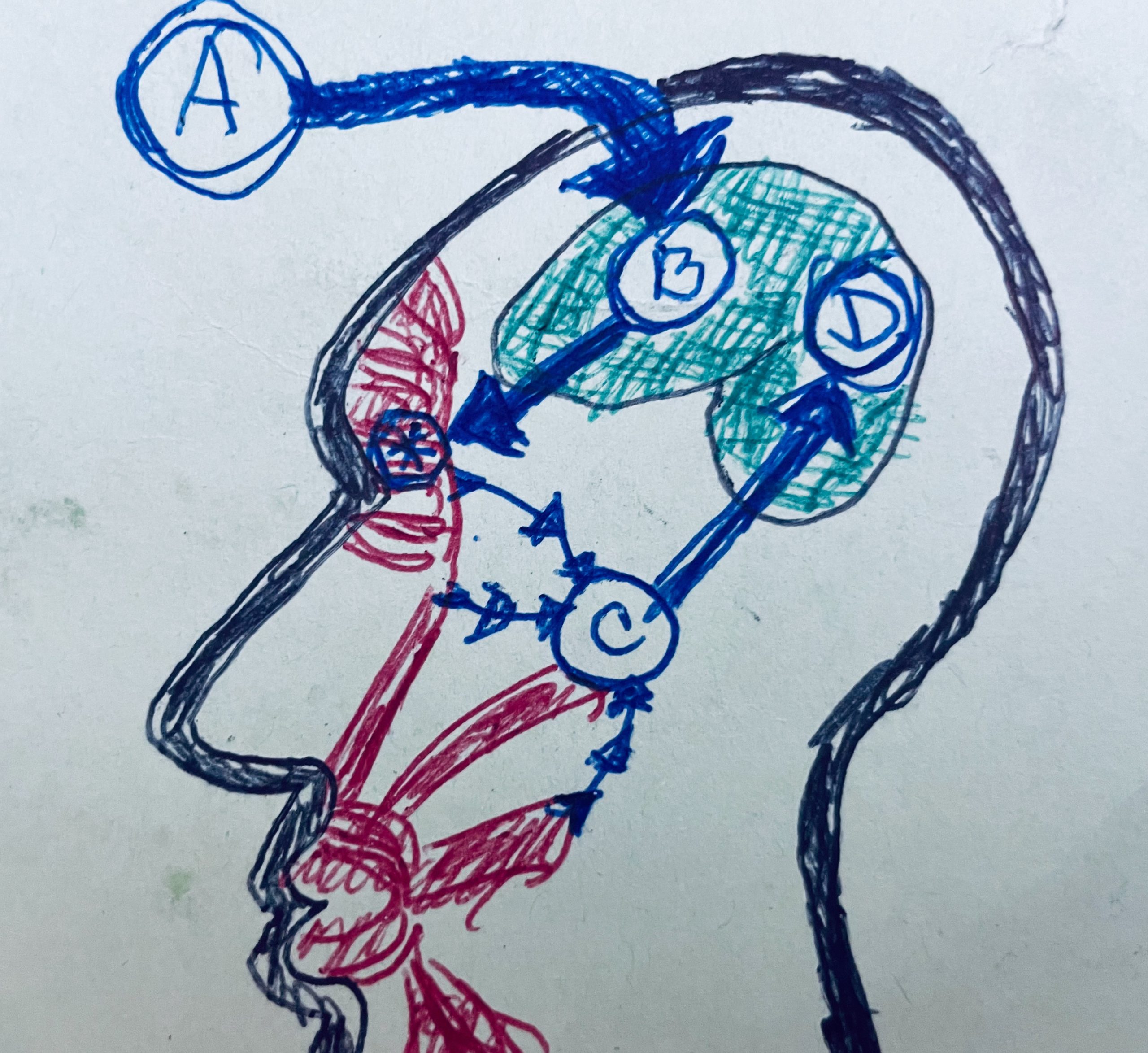 And so (in our diagram of the Facial Feedback Loop), one of the ideas is that once the idea enters the consciousness (illustrated by the, "A arrow"), then the "B arrow" perceives it. And it triggers facial musculature activation.